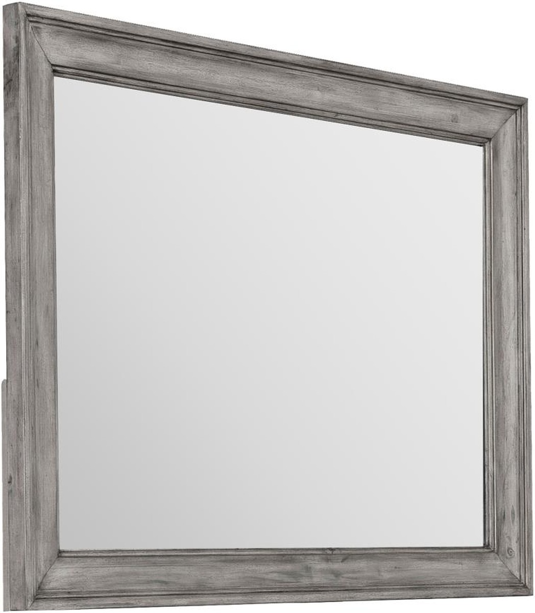 Create a charming dressing area in your rustic bedroom with this traditional framed mirror. Designed to rest on top of a matching dresser in a horizontal position, this sophisticated framed mirror features restful rectangular shape. A grey finished wood frame surrounds the edge, offering a weathered appearance along with definition against your existing focal wall.Read More