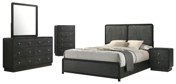 Reimagine your bedroom entirely with the sophistication of modern bedroom set. It focuses on a chic upholstered bed that features a pair of padded panels with charcoal fabric that creates a soft, inviting presence that's perfect for lounging while maintaining a refined look. Storage pieces add ample space for organization.Read More