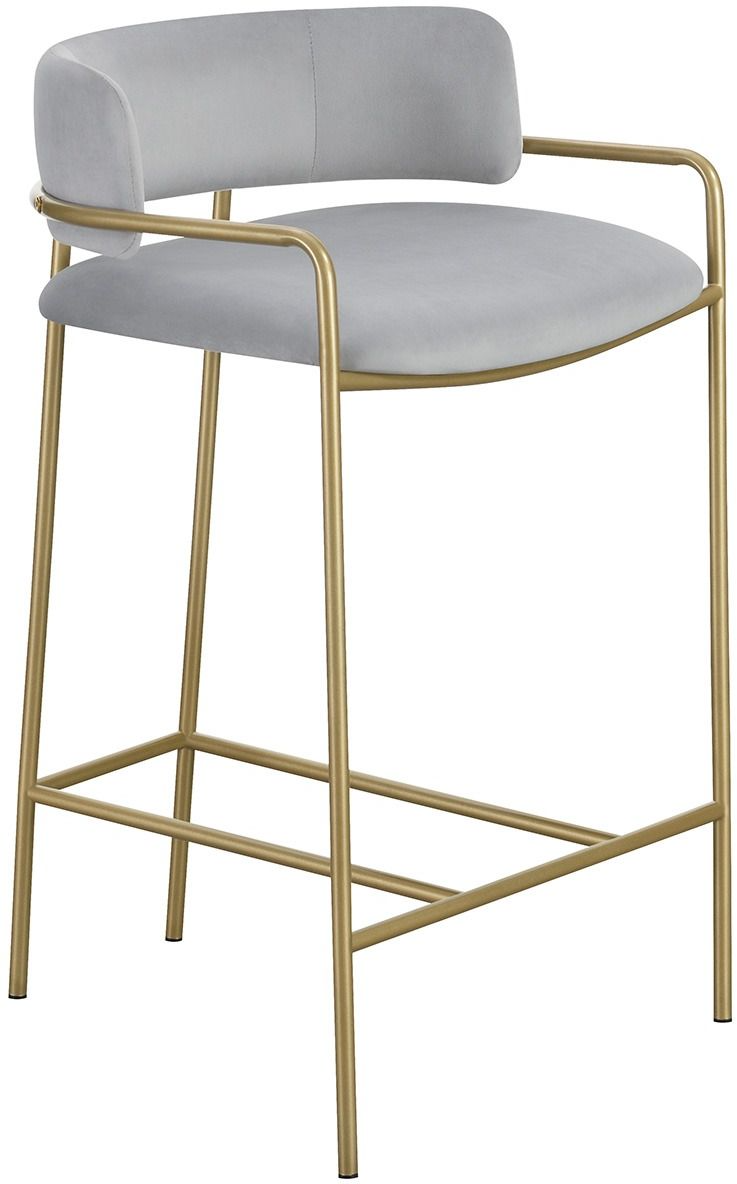 This bar stool features a gray upholstered seat supported by a sturdy gold-finished frame. Designed for durability and comfort, it offers a sleek, versatile look that works well in kitchen bars or casual dining areas.Read More