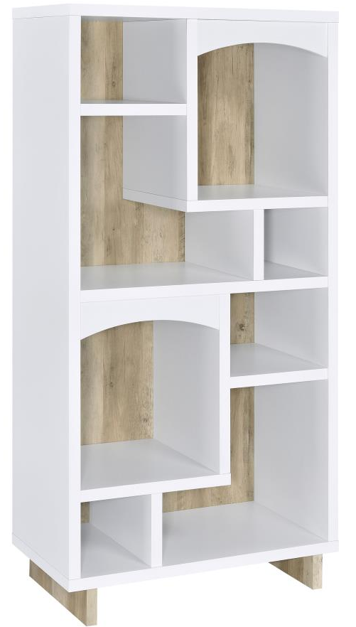 Two-tone finish creates depth with a brown wood backing and legs and white sides and shelves