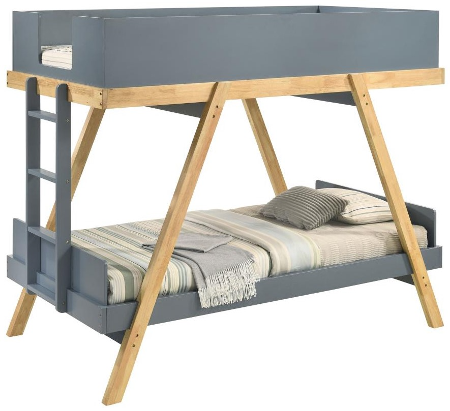Refresh a bedroom with the farmhouse charm of a modern bunk bed with a twin-over-twin configuration. It takes design inspirations from a classic trestle, complete with angled supports and a two-tone finish that highlights its character. The upper bunk is surrounded on three sides with solid panels, adding safety. Its attached ladder provides access through the footboard.Read More