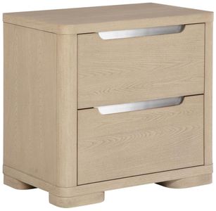 Blending sleek design with practical functionality, this nightstand features a light elm finish and brushed nickel fingertip pulls for a subtle sparkle. Rounded corners enhance its modern appeal, while two extra-large drawers offer ample space for bedside essentials. The top drawer, lined with gray felt, adds a touch of elegance.Read More