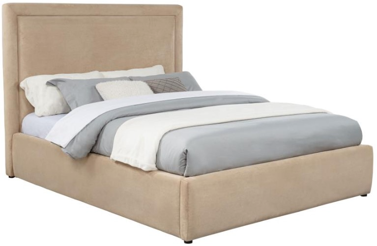 Full bed with clean panel headboard and fully upholstered low-profile frame