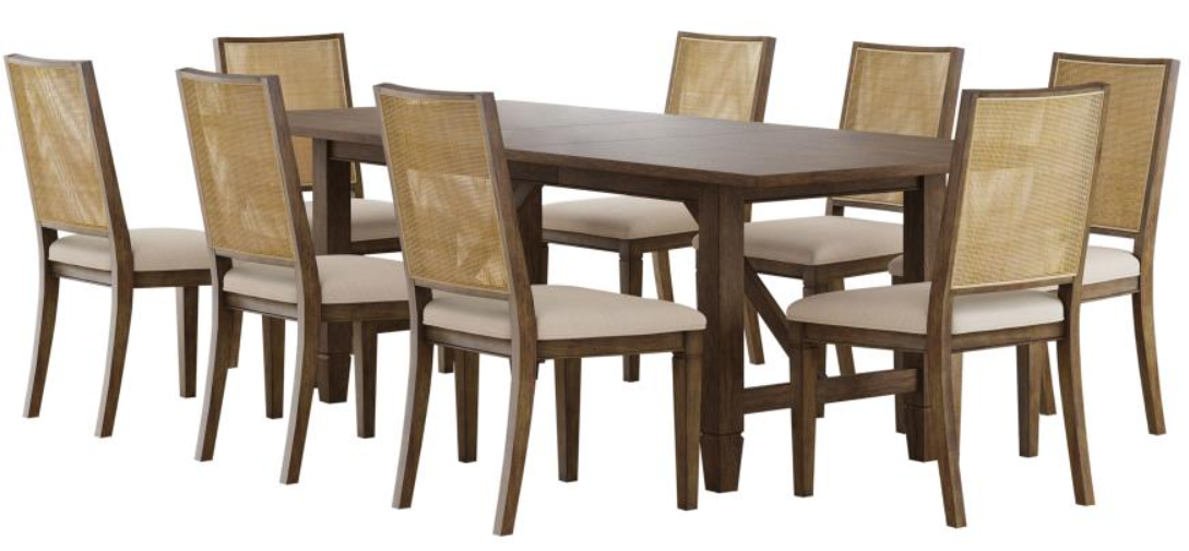 Includes: One (1) dining table and eight (8) side chairs