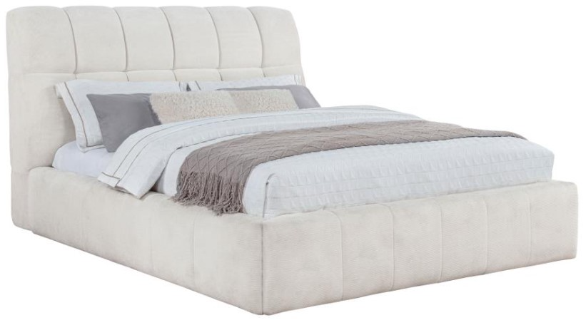 Tailored with bold lines and soft texture, this upholstered platform bed blends comfort with quiet strength. Vertical channel tufting runs along the headboard and foot rails, adding dimension and rhythm to the silhouette. Wrapped in plush fabric and fully slatted for support, it eliminates the need for a foundation.Read More