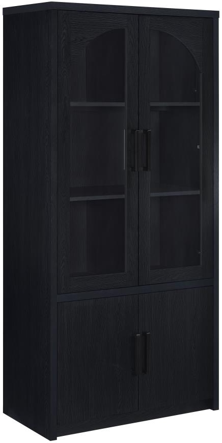 Below, concealed storage offers hidden utility behind panel doors, each compartment thoughtfully fitted with adjustable shelves. Cloaked in a deep black woodgrain, this cabinet brings quiet drama and timeless refinement to any curated space.