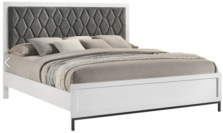 The padded headboard offers excellent comfort and dark gray faux leather upholstery. A streamlined wood frame adds a bright white finish to the rectangular head and footboards, creating an open, airy look. This stylish bed is complete with black accents in the base of the footboard and requires a foundation for use.