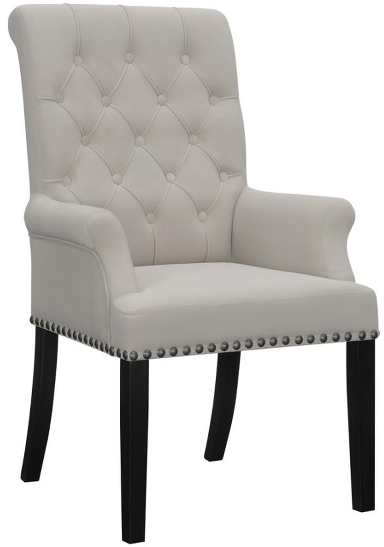 Cap the ends of your formal dining table with this transitional armchair for a classical flair. An elegantly rolled backrest paired with rolled armrests, along with button tufted details, boasts traditional elements to tie together a space.Read More
