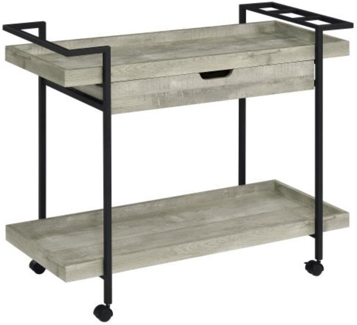 A black finish metal frame includes handles, with three open squares on one side that help to keep bottles upright. A casual gray wood grain finish accents the look with farmhouse inspirations, perfect for relaxed living and dining rooms. Ball bearing drawer glides and caster wheels complete the cart with smooth, seamless performance.