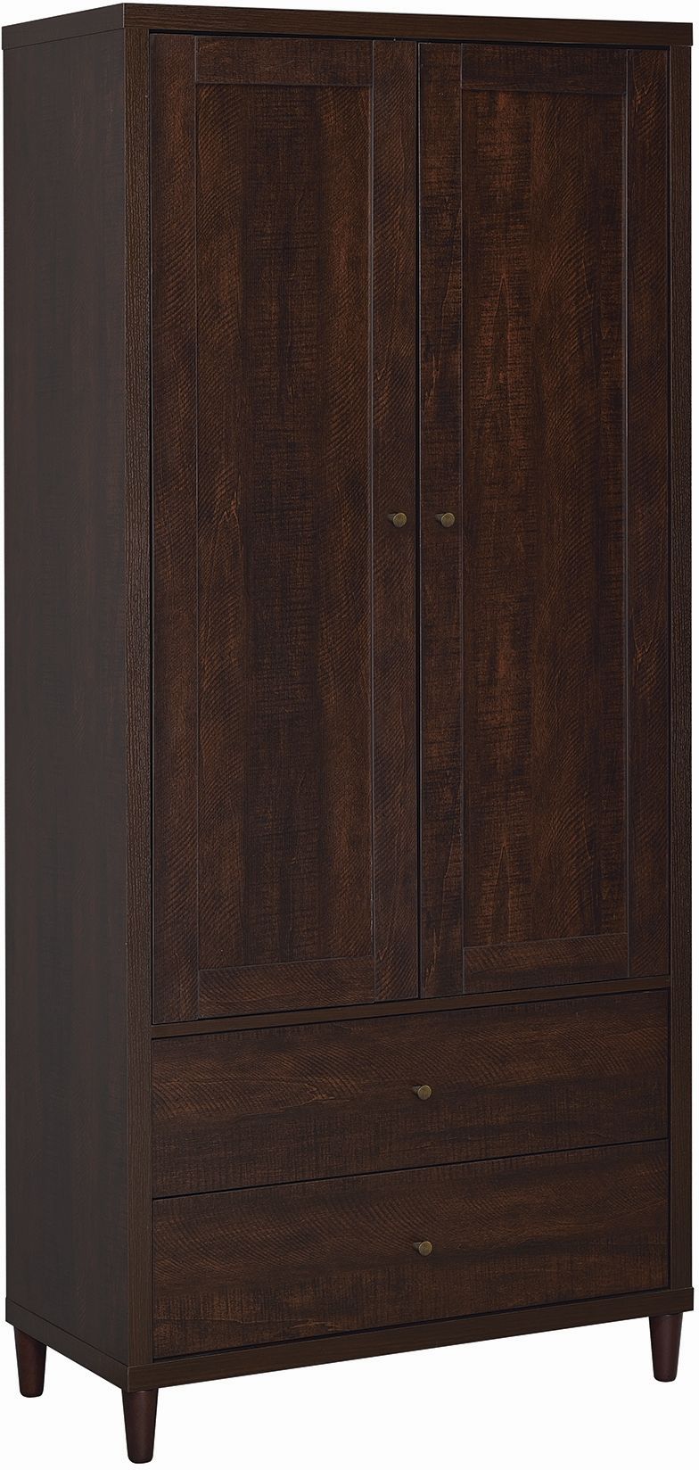 Hardware in brass finish enhances the look of this tall cabinet