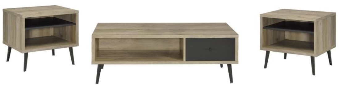 Coffee table set includes a cocktail table and end table with a retro design influence