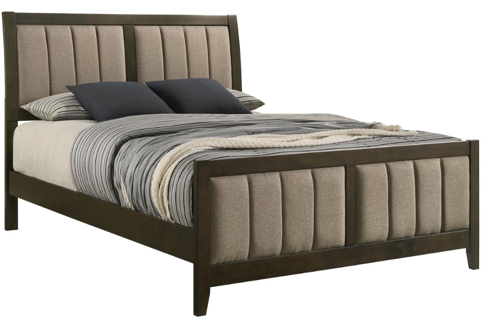 This panel bed adds a luxurious touch to your bedroom with its bold vertical channel tufting on the padded headboard and footboard. The dark cocoa finish complements the soft brown fabric upholstery, creating a warm, inviting aesthetic.Read More