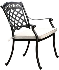 Host a quaint dinner party outside with this charming outdoor dining set. The lengthy table top features a beautiful reinforced top with elegant mosaic detailing. For durability and style, the antique black finished aluminum framework can be found along both table and chairs. Paired chairs also come with handy tie-back ivory cushions for extra comfort and charm.Read More