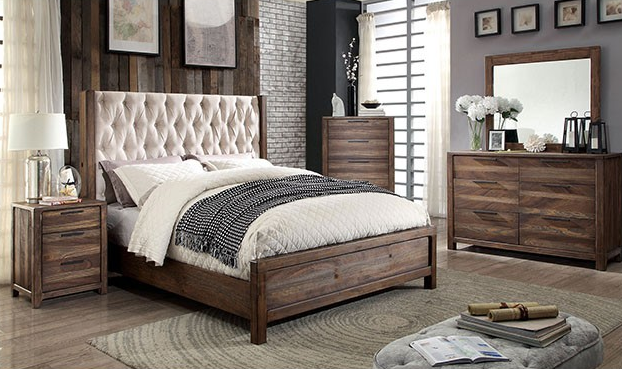 Set the scene for serene relaxation with this beautiful set and its gorgeous rustic natural tone finish. Diamond tufting can be found all along the fabric upholstered wingback style headboard while the wood grain emphasizes the natural finish. The simple design speaks volumes with its elegant centerpiece and supporting case goods.Read More