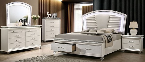 Create a room made for a princess with this bedroom set from the Maddie Collection. The curved headboard is padded and upholstered in a horizontally-tufted leatherette, emphasizing the pearl white finish. The dresser and chest feature acrylic legs, crystal accents, and a beveled mirror with a LED light creating a glamorous aesthetic. Give into your glitzy side with this opulent set.Read More