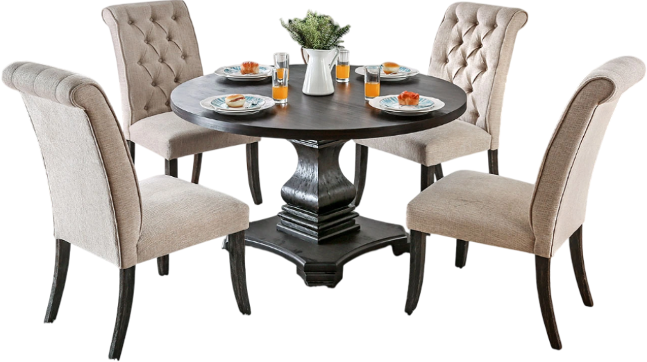 Enjoy breakfast, lunch and dinner in style. This round pedestal table comes paired with ivory linen dining chairs to create a luxurious atmosphere. Button tufting and a scrolled backrest emanate a regal and feminine style that pairs beautifully with the antique black finish.Read More