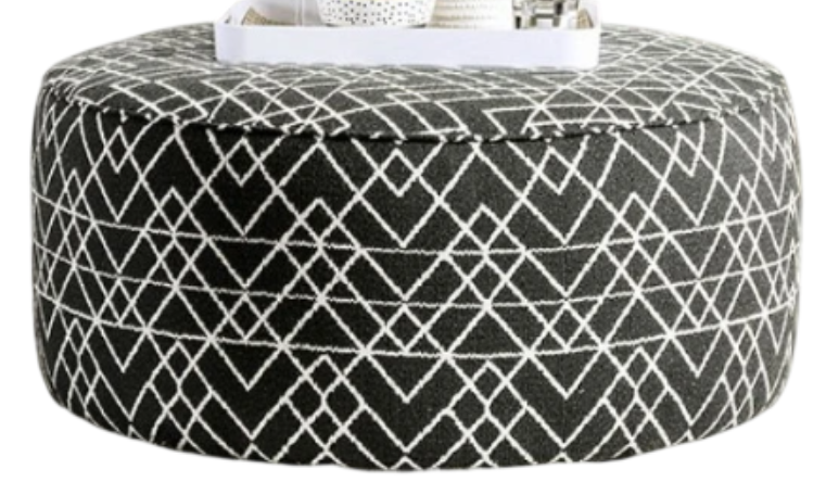 This tall round ottoman enthralls with its geometric pattern. The ivory lives dance across the black upholstering and helps add a sense of height to the piece. The welting trim stands out just enough to add another visual element to the piece.Read More
