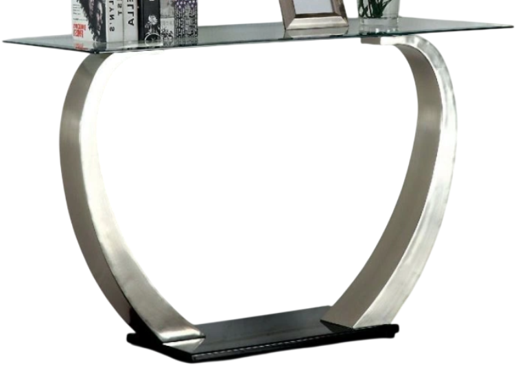Furniture of America® Roxo Sofa Table with curving pedestal and beveled tempered glass topRead More