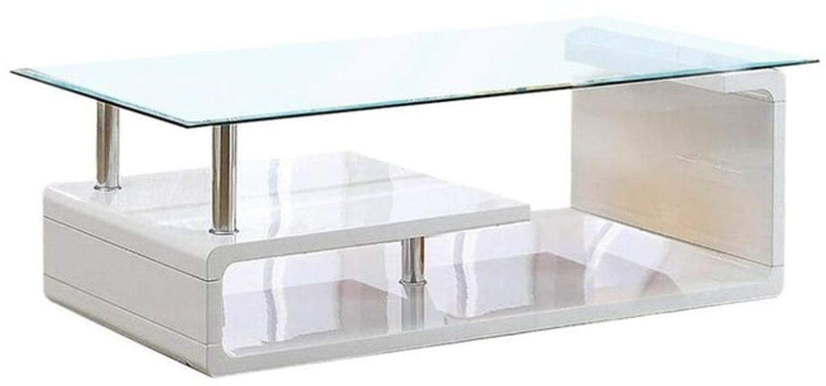 This coffee table set is designed to please your need for modern and minimalistic aesthetics. The curling high gloss coated wood makes for a unique visual and creates multiple shelving and display options beneath the glass table tops. Chrome supports add a touch more to the contemporary appeal.