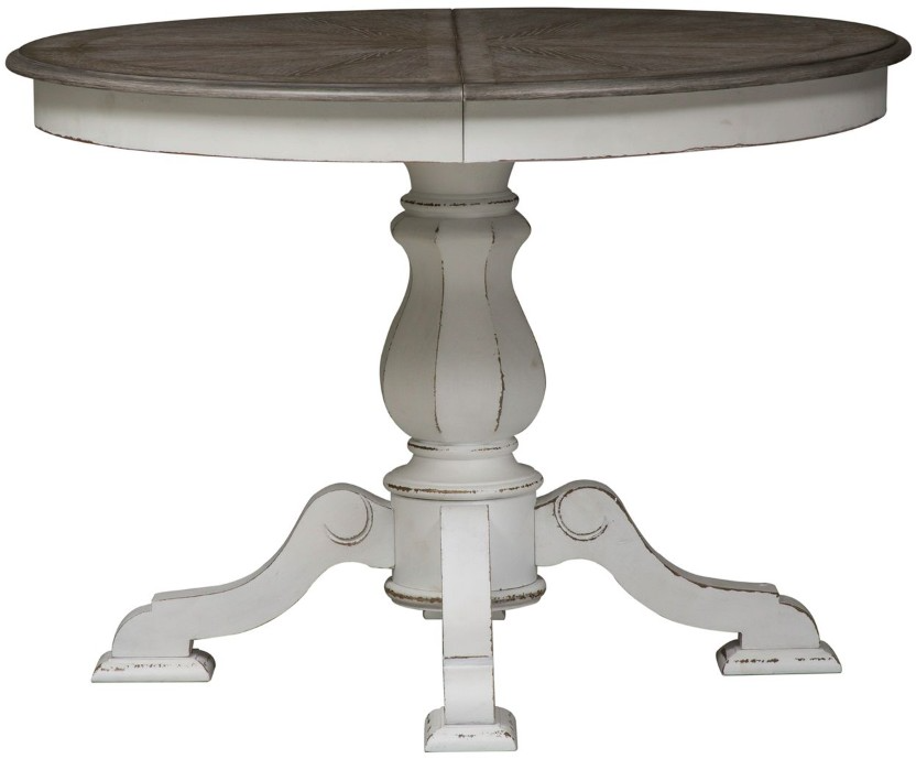 Gather the family together for dinner around the Magnolia Manor pedestal table. A 42" round is perfect for small spaces or add in the 18" leaf to expand the table to an oval for larger crowds. This features a fancy face top finished in a weathered brown.Read More