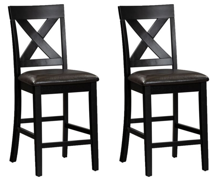 The Thornton II X Back Counter Chairs are constructed of black finished wood and a brown vinyl seat.