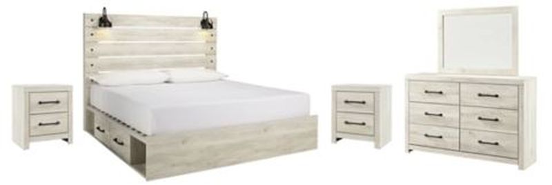 Includes panel storage bed (headboard, footboard, side storage, rails and slats), two 2-drawer nightstands and 6-drawer dresser with mirror