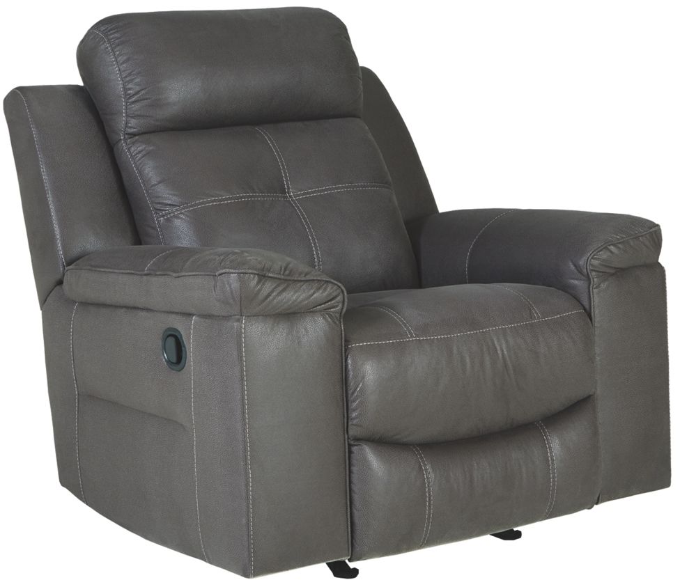 Rustic character comes forth in this dark gray rocker recliner. Designer stitching adds a fashion-forward touch to its soft cushions. Faux suede fabric speaks to your knack for superior-quality materials. The recliner’s high back provides ample support as you get off your feet for a bit.Read More
